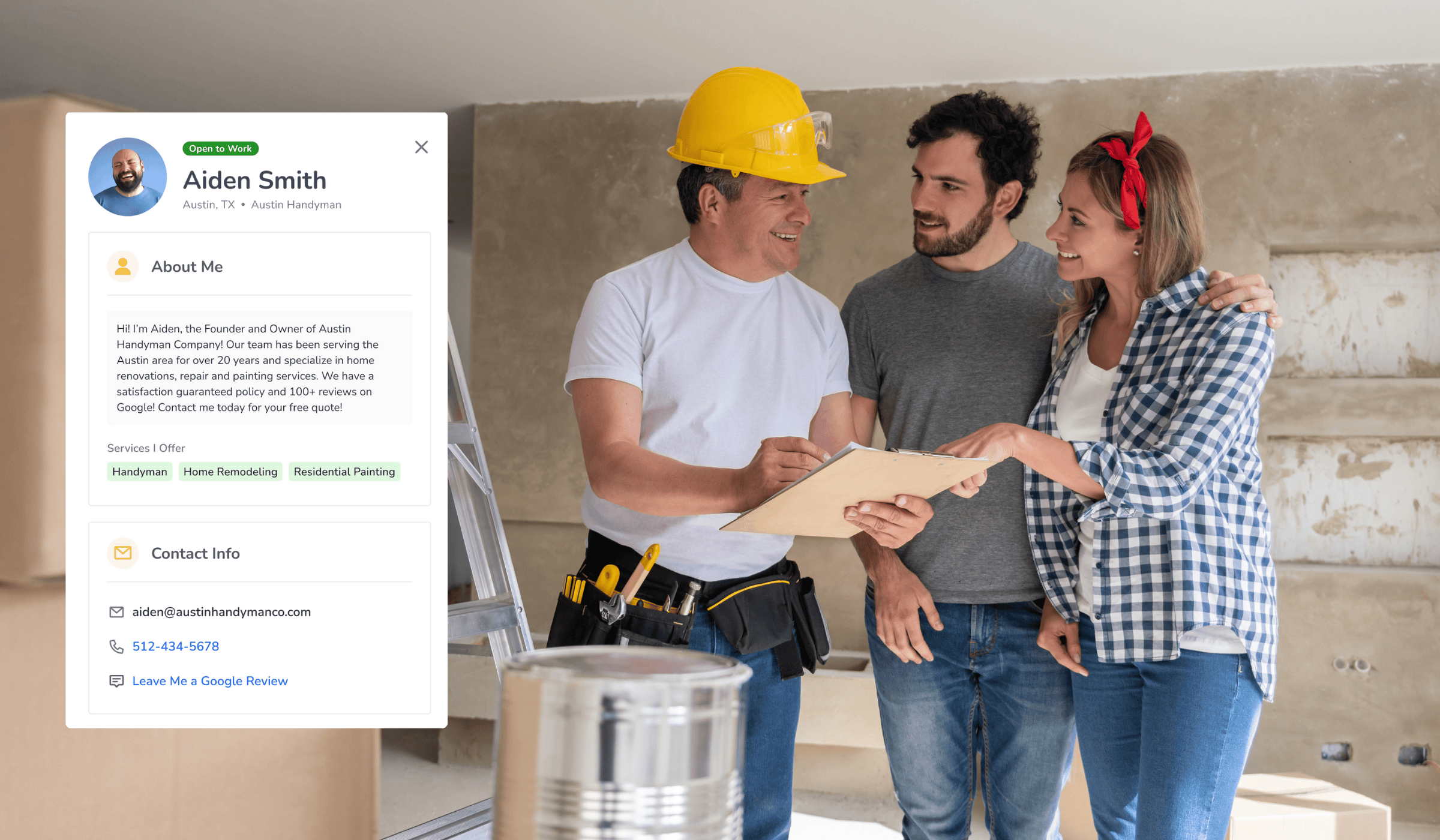 Showcase your services, contact info, Google reviews, and even the other vendors you refer.